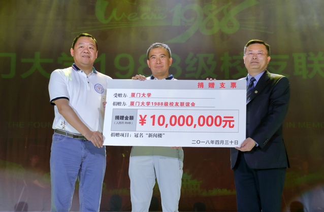 会上,1988级校友联谊会向母校捐赠一千万元。张荣代表学校接受捐赠并向88级校友代表,德邦物流股份有限公司董事长崔维星、美亚柏科信息股份有限公司董事长滕达颁发了捐赠证书。会上还宣布成立“八八情怀 思源基金”,这是1988级校友联谊会为凝聚校友资源、感恩助力母校设立的基金。思源基金目标募集3亿元,现有近亿元的基础基金。基金将由专业的运营团队管理,每年把一部分收益用于厦门大学“双一流”建设、百年校庆、人才培养等重要工作。