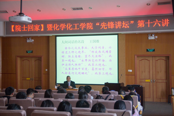 讲座伊始,吴新涛说到,他能够在科研上取得一点成绩,主要得益于在厦大接受很好的课业教育、科学素质培养以及良好的品德教育。他以诚挚而朴实的语言迅速拉近了与在场师生的距离。讲座中,吴新涛结合自身的成长经历和科研经验,就传统文化的对联与诗词、科学的创新思维、正能量、关于“双一流”建设的一些思考这四部分展开分享。吴新涛列举了孔子、韩愈、林则徐、毛泽东等人的诗句来说明中国的诗词有很大的内涵,对科技创新大有益处。谈到科技创新思维培养,吴新涛院士强调要学习弘扬了徐光宪先生的科技创新思维。他说,做学问要重视知识的积累、科学道德的培养、学科交叉与学术交流,要老老实实地做学问,每一个数据都要经得起考验,不能弄虚作假。吴新涛还勉励同学们要在大学期间多做些有意义的志愿服务工作。