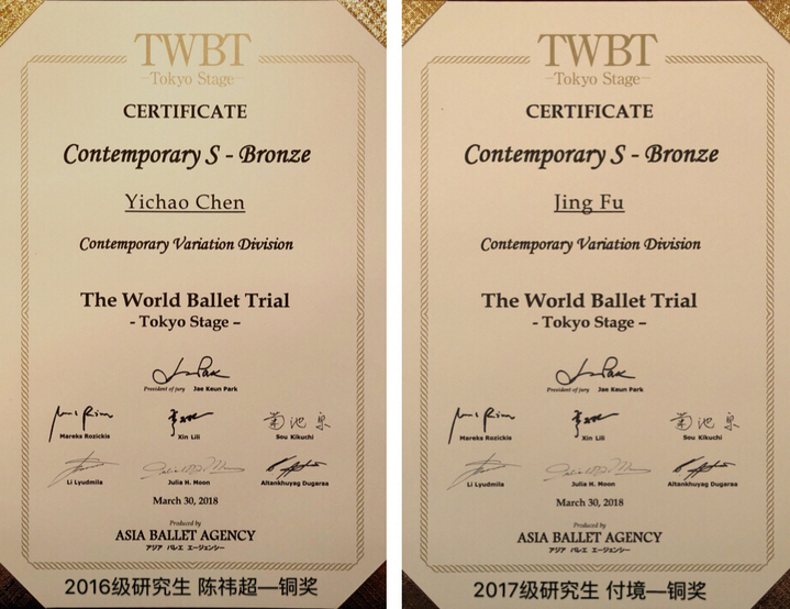 继第二届世界芭蕾舞比赛欧锐获得了该组别的金奖后,今年,又有这两位研究生获得了该组别的两个铜奖。我校从2013年开始招收舞蹈研究生以来,一直注重提高学生的专业水平和理论素养,为学生提供实践和提高的平台。在校研究生院和艺术学院的大力支持下,在各级领导的关心指导下,市级、省级、国家级到国际赛事中喜讯频传。教师在指导上精益求精,编创上不断创新,学生在高强度的训练中也在不断地自我突破,这两次优异成绩的取得,充分说明了我校研究生教学已经逐步同国际舞台接轨,在现代芭蕾舞方面已取得了新的突破和更多的创新。