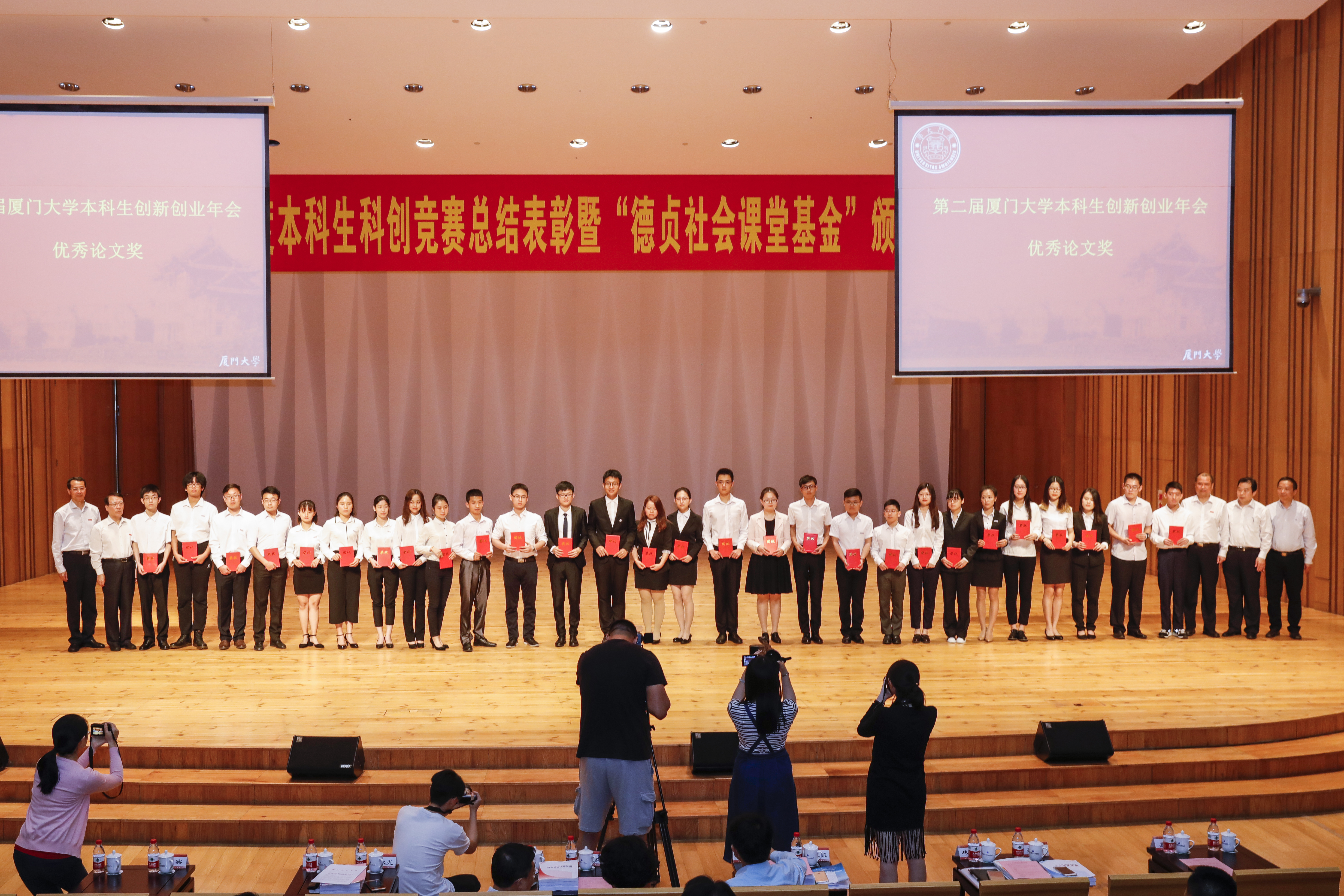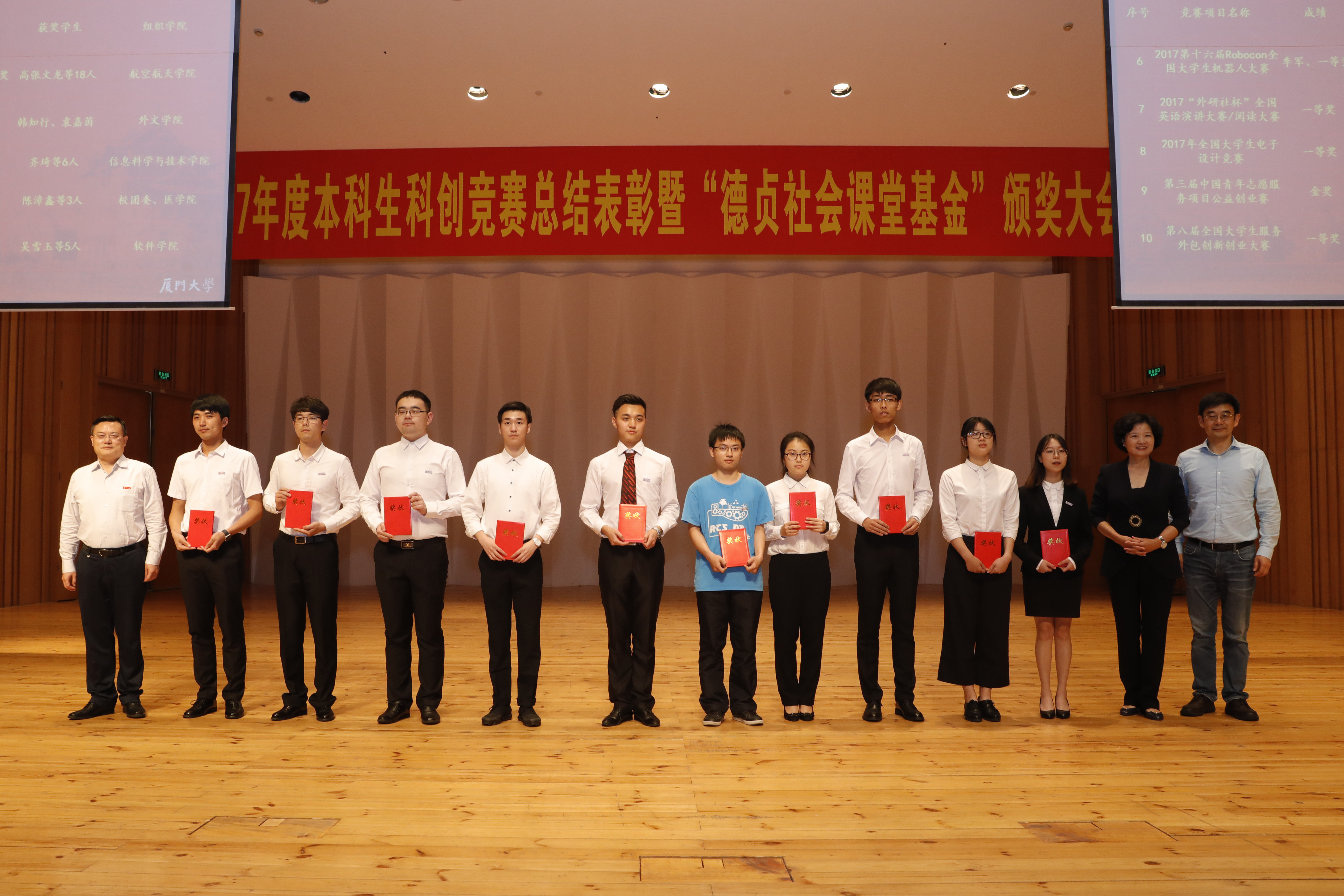 4月4日下午,我校在科学艺术中心隆重举行2017年度本科生科创竞赛总结表彰大会暨“德贞社会课堂基金”颁奖大会。大会作为第二届厦门大学本科生创新创业年会的重要内容,继续设立指导教师突出贡献奖,奖励在过去五年中指导本科生科创竞赛贡献突出的教师;奖励优秀科创项目,鼓励学生积极参与科研创新;多方筹措资金,积极争取校友(德贞社会课堂基金)、企业捐助,奖励额度超过130万元。