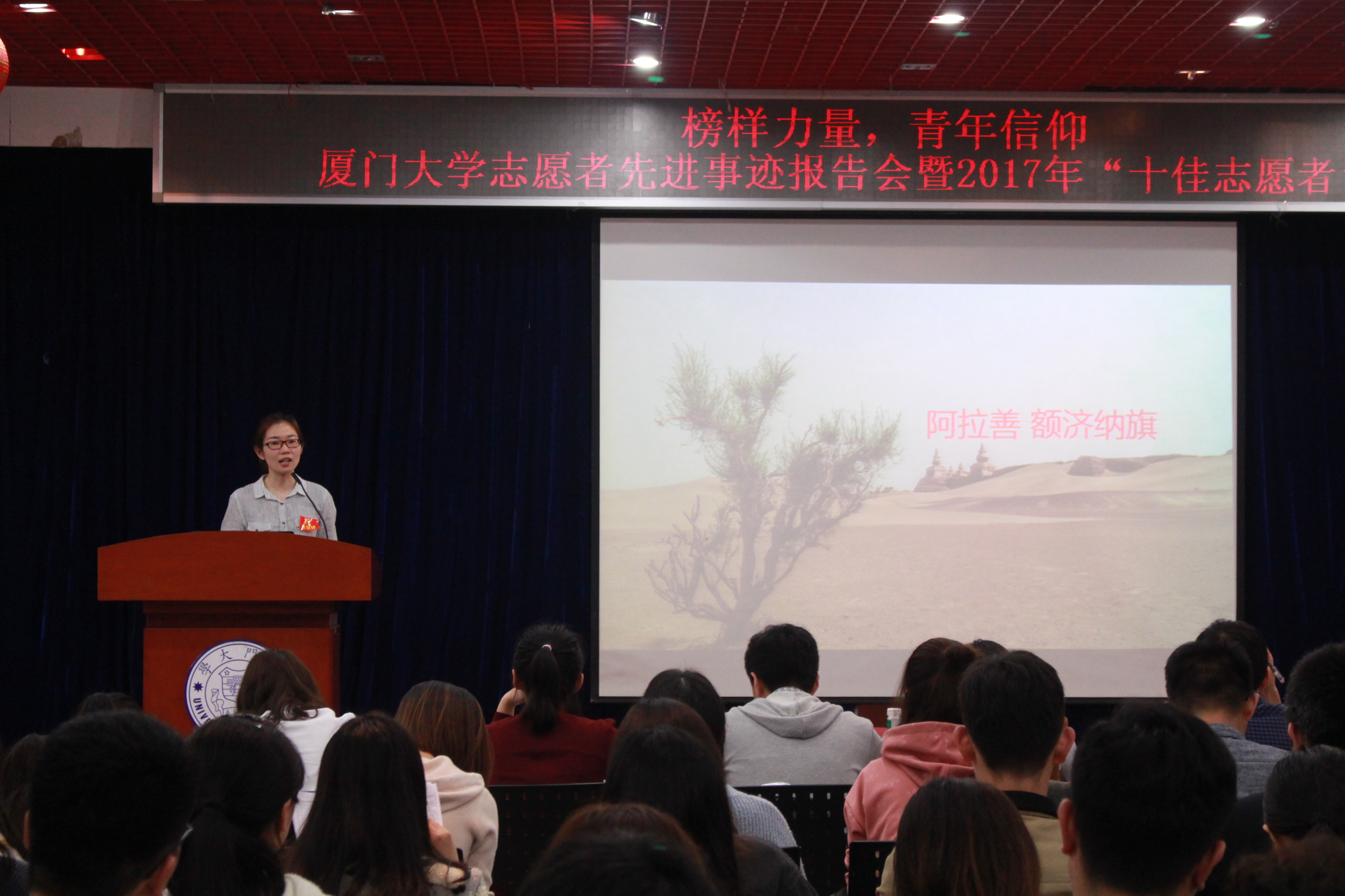 为更好地传播志愿服务文化,发挥同辈的榜样力量,今年十佳志愿者评选以志愿者报告会的形式进行。校团委于3月5日晚19:30在思明校区多功能厅举行“榜样力量 青年信仰”——厦门大学志愿者先进事迹报告会,由学院、各志愿服务类社团推荐的22名十佳志愿者候选人每人通过5分钟的演讲,向观众讲述他们在志愿服务中的故事、感悟与思考,由校青年志愿者协会代表、各学院本科生团总支书记、优秀志愿者代表组建的65人评审团为候选人进行打分,最终评选产生2017年“厦门大学十佳志愿者”。评选会当天,共有来自全校各学院的近200名的同学到场聆听了候选人们精彩的演讲。