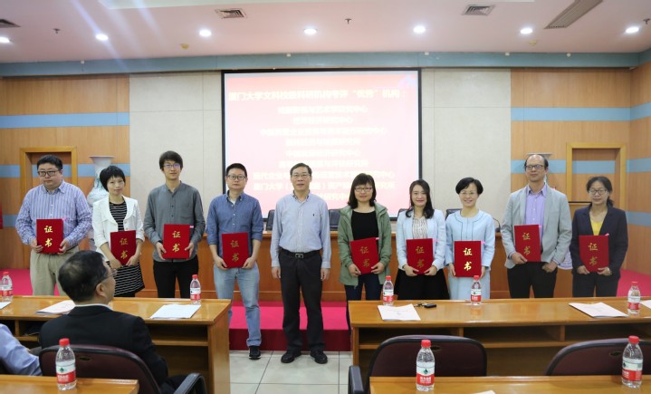 会上,李建发为在我校文科校级科研机构三年一次考核评估中获得“优秀”的戏剧影视与艺术学研究中心、世界经济研究中心、中国民营企业投资与资本运作研究中心、国民经济与核算研究所、中国能源经济研究中心、高等教育质量与评估研究所、现代企业与医疗服务运营技术管理研究中心、厦门大学(正泰数据)资产综合管控研究所、管理会计研究中心等9个校级科研机构颁发了证书。优秀校级科研机构代表姚昕、文静、韩水华等3位老师分别汇报和分享了各自的机构建设经验。社科处副处长林木顺在会上作文科科研机构建设情况报告,对我校文科科研机构建设情况进行了梳理和总结,他指出,我校在文科科研机构建设方面取得了不少成绩,但也存在一些问题,如:部分机构活力不足、品牌意识不强、日常管理不够规范等。林木顺认为做好科研机构建设需要不忘机构成立初心,要花时间、投精力、借鉴好做法,不断增强机构的活力与影响力。