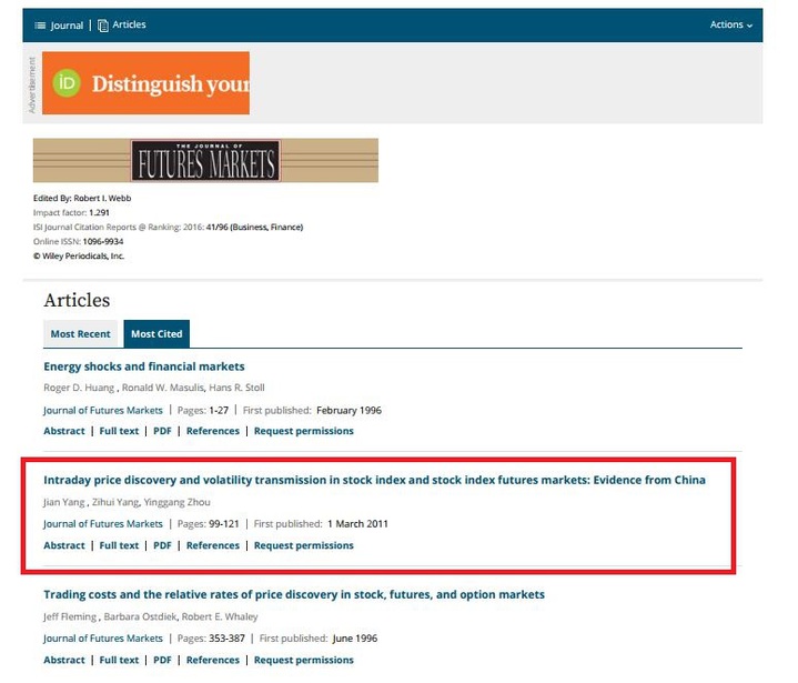 据Journal of Futures Markets近日发布的消息,厦门大学周颖刚教授与美国科罗拉多大学(丹佛校区)杨坚教授、中山大学杨子晖教授合作的“Intraday Price Discovery and Volatility Transmission in Stock Index and Stock Index Futures Markets: Evidence from China”,入选成为JFM这一期货市场和衍生产品领域国际权威刊物发表的文章中引用率最高的论文之一。据Google Scholar统计,该文自2012年正式发表以来已经被国内外文章他引156次,其它两篇被引用最多的文章均是金融学领域著名学者Hans Stoll、Robert Whaley等人1996年的文章。