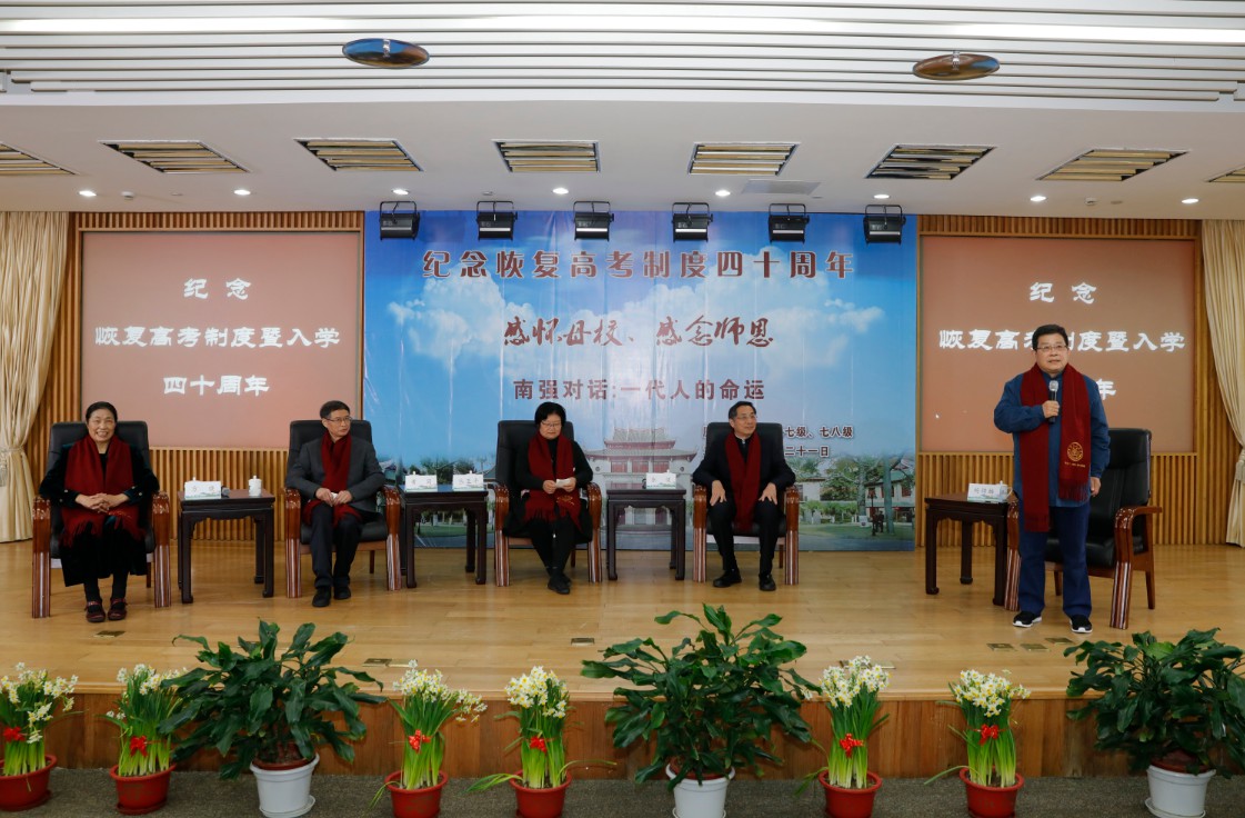 2月21日上午,纪念恢复高考及77、78级入学40年,一场具有特殊意义的纪念活动在科学艺术中心举行。130多名中文系77、78级校友重返母校与师长欢聚一堂,重温当年难忘的岁月。同时,作为恢复高考制度后首批进入大学的、来自海内外各地的中文系77、78级同学,以自己的亲身经历与切身感受,追忆40年前那场改变中国教育与整整一代人命运的高考,启动了一场“恢复高考制度与一代人的命运”的南强对话。校友总会理事长、原校长朱崇实在活动上致辞,副校长、校友总会副理事长詹心丽出席活动。
