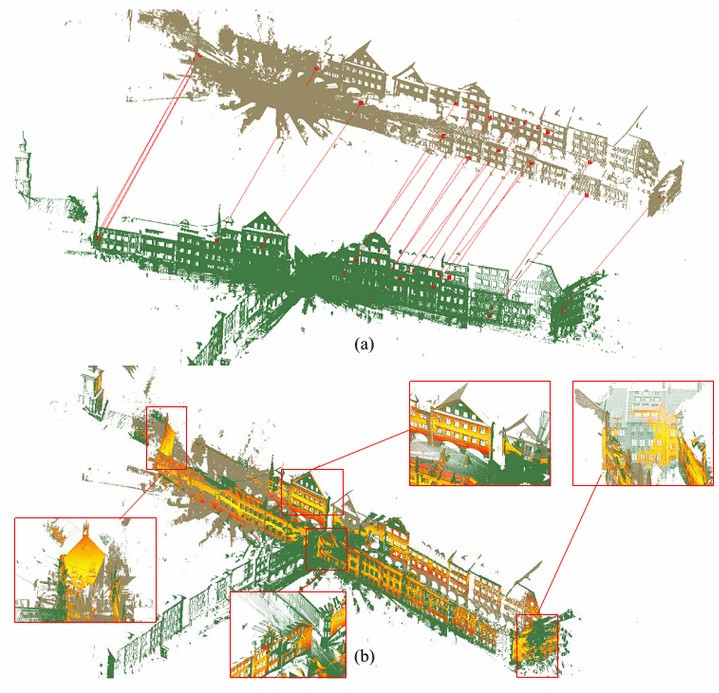 该论文提出了一种基于协方差描述子和博弈论的成对点云配准算法,用于解决由高性能激光扫描仪获取的高密度三维点云数据的配准问题。三维点云局部特征描述在三维目标识别与分类、点云语义分割、点云配准以及三维形状检索等应用中具有关键性作用,是目前三维计算机视觉领域一个新的研究热点。现有的点云局部特征描述主要采用几何信息构建描述向量,没有充分利用三维点云的所有信息量(包含几何、颜色、强度信息等),针对该问题,宰大为等提出了一种新的基于协方差矩阵的特征融合方法,通过充分利用三维点云的信息量来构建特征描述,并利用协方差矩阵的统计特性来描述特征之间线性共性关系进行特征融合。该成果在鲁棒性以及抗噪性等方面超过了当前点云特征描述技术发展的最高水平。另外,宰大卫等还提出了一个有效的基于博弈论的对应点对提取算法,通过分析全局的对应点对几何约束关系,快速剔除海量错误点对。该算法简单有效,显著地提高了当前三维点云配准的精度及鲁棒性。