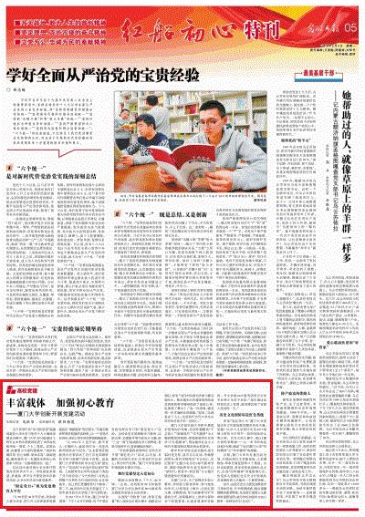 光明日报2月5日第五版刊发了题为“丰富载体 加强初心教育——厦门大学创新开展党建活动”的长篇通讯。通讯分“固定党日+”成为党建教育大平台、舞台党课坚定入党初心、历史文化展馆诉说红色传统三个部分,从不同角度报道了我校创新开展学生党建的经验。文章说,学校探索多渠道、多载体、多平台开展党的知识教育活动,让学生在活动中接受教育。