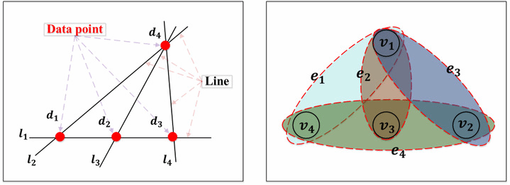 相比简单图,超图模型能够表示更加高阶的复杂关系。然而,当前基于超图的模型拟合方法无法完整有效地表示模型假设与数据点之间的关系。王菡子教授课题组研究提出新的超图顶点与超边定义并引入内点噪声尺度估计来解决该问题,通过充分利用超图的高效性来提高模型拟合算法的精度。该成果将传统模型拟合方法的计算效率和拟合精度提高到了一个新的层次。另外,王菡子教授课题组还提出了一个有效的模式搜索算法,通过分析超图顶点之间的关系,快速地搜索定位其中的模式。该算法不仅简单而且有效,较大程度上缓解了传统模式搜索算法难以解决的高复杂度问题。