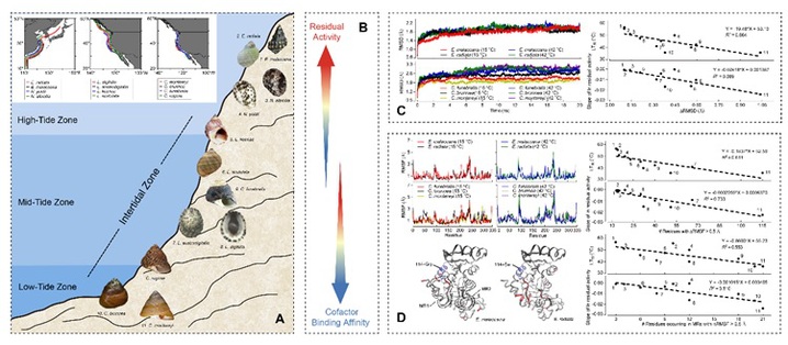 为适应不同的生境温度,酶分子需要保持稳定性(Stability)和柔性(Flexibility)之间的平衡,在一定温度范围内,既保证结构的稳定性同时维持酶的催化活性,这是生物对环境温度的长期进化适应。在高潮间带耐高温贝类中,cMDH局部柔性的增长使酶在较低的温度下能维持催化功能,并在高温条件(> 55 °C)保持结构稳定和催化功能。该研究以具有不同水平(纬度跨度达40 °)和垂直(从高潮间带到低潮间带)分布、生境原位温度跨度达60 °C的五个属12种海洋软体动物为研究对象,结合生化实验手段和计算机模拟实验方法,进一步定量测定了cMDH稳定性和柔性变化程度。研究发现,随温度升高,冷适应蛋白质稳定性和活性下降趋势更明显。蛋白质骨架原子热诱导运动程度(RMSD)与生物适应温度之间存在显著的负相关关系;当温度从15 °C升至42 °C,柔性变化(RMSF) > 0.5Å的氨基酸残基数随生物适应温度升高而降低。此外,该研究还定位了海洋软体动物cMDH温度适应性变化发生的位点/区域,指出了氨基酸序列变异位点对其的“远端效应”。