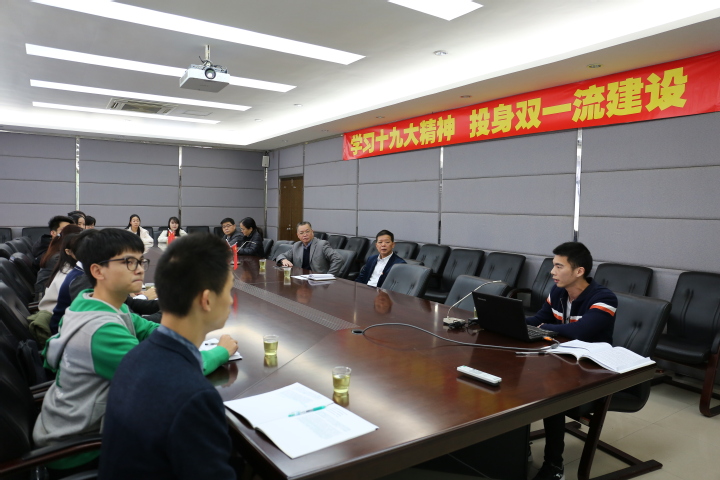 郑小平首先就本支部学习和践行十九大精神的情况作了汇报。与会党员和入党积极分子积极讨论,他们纷纷从不同的角度出发,表达了自己对“双一流”建设的所思所悟。支部党员匡奕臣与朱展图分别从党建引领团建和校园文化建设角度出发,阐述了在新时代下研究生党员应如何坚定理想信念。杨一龙结合学科评估,对比兄弟专业,摆问题、找差距。黎莹结合自身暑期国外交流经历,认为学校在“双一流”建设中应深化对外合作交流。黄广结合自身创业经历,谈了学校和学院对提高学生创新创业能力所提供的各方面支持。徐叶子、张璐、孙文倩、王栋也纷纷结合自己参与的科研项目及科创比赛经历谈了对“双一流”建设的看法。大家一致认为全校师生是“双一流”建设的主人翁,应该利用自身专业优势,发挥专业特色,为学校“双一流”建设添砖加瓦。