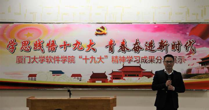 12月22日晚七点半,软件学院在海韵园物理机电大楼117教室,举行了主题为“学思践悟十九大,青春奋进新时代”的学习成果分享展示会。学院学工组全体成员、学院三个教工党支部支委、软件工程系和数字媒体工程系系主任和本硕博各年级的学生代表出席了本次展示会。