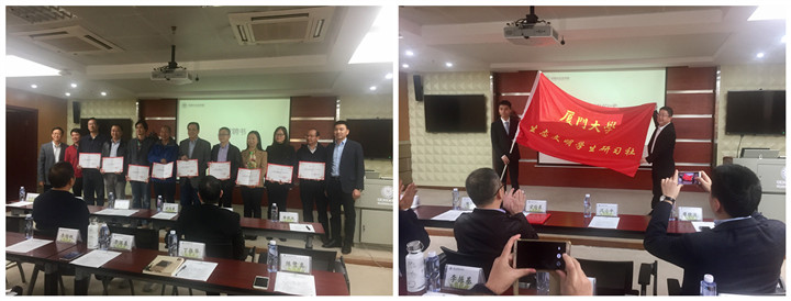 环境与生态学院党委副书记许美霞宣布研习社骨干任职名单,厦门大学生态文明学生研习社社长陈天白同学介绍社团基本情况和工作规划。之后,曹文志副院长宣读研习社首批指导教师聘任名单,并由李庆顺、张清榕、廖晓波为研习社12位校内外指导教师颁发聘书;同时环境与生态学院党委书记沈小平为研习社授社旗。