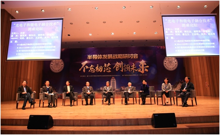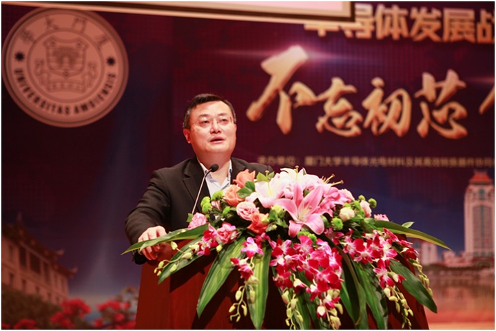中科院王启明院士、褚君浩院士、王立军院士、刘明院士、杨德仁院士,科技部高新司原司长赵玉海,科技部高新司副司长曹国英、国家自然科学基金委员会信息科学部常务副主任秦玉文、国家半导体产业联盟吴玲理事长,厦门大学校长张荣,以及来自科技部、中科院、清华大学、北京大学、南京大学等研究单位的知名专家出席本次大会。此外,半导体行业相关媒体和证券媒体,厦门市政府领导、南昌市政府领导、扬州市政府领导等也出席了研讨会。开幕式由我校物理系康俊勇教授主持。