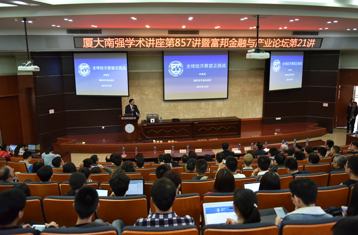 当天下午,林建海秘书长在经济楼N402,做了题为“全球经济展望与挑战”的讲座。此次讲座为厦大南强学术讲座第857讲,亦是厦大富邦金融与产业论坛第21讲。厦大师生及校外经济、金融相关行业精英近400人到场听讲。
