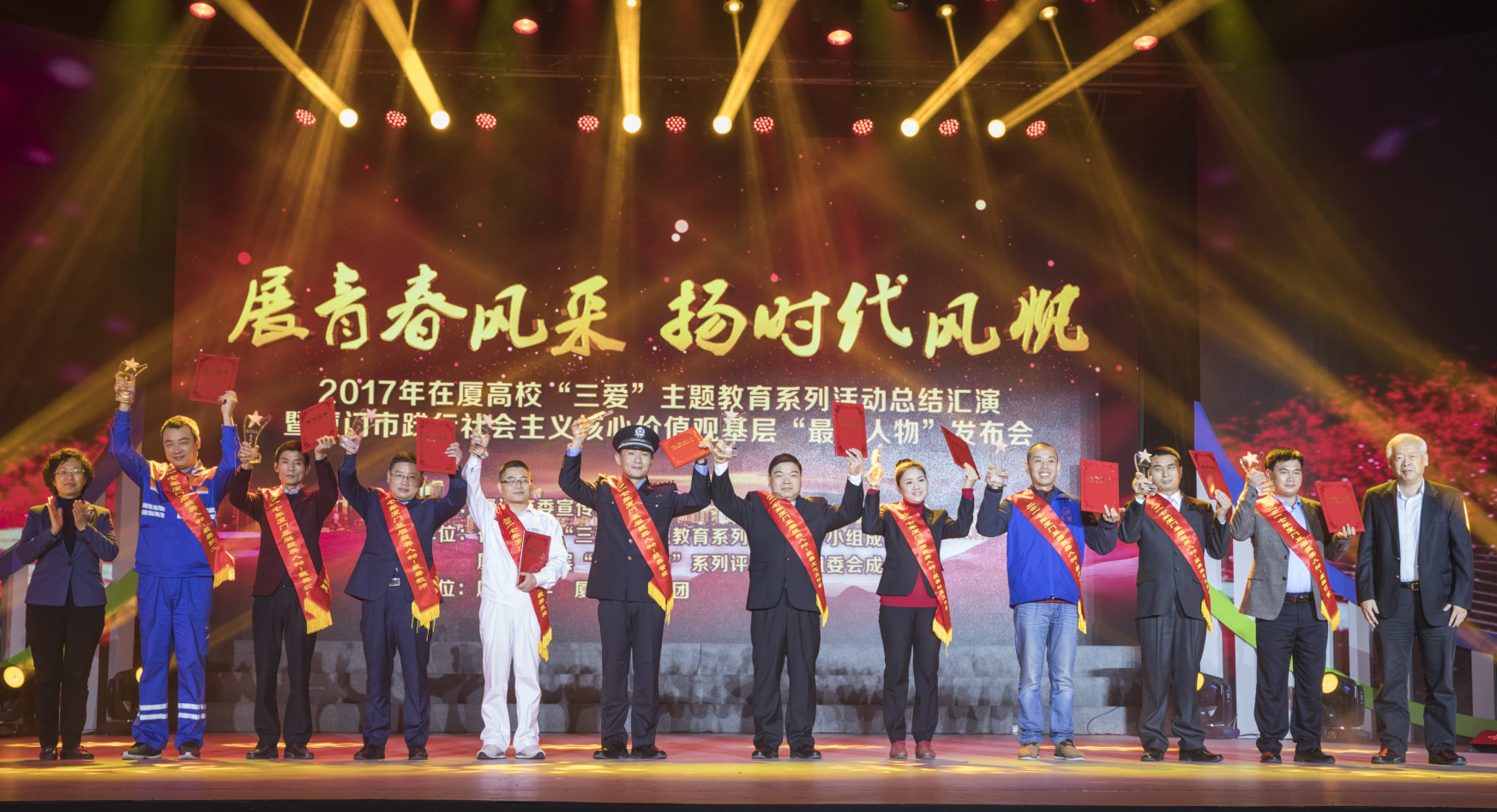 12月8日晚,2017年在厦高校“三爱”主题教育系列活动工作总结大会暨厦门市践行社会主义核心价值观基层“最美人物”发布会在我校建南大会堂举行。市委常委、宣传部部长叶重耕,副市长国桂荣,我校党委副书记、纪委书记赖虹凯以及在厦高校“三爱”主题活动领导小组成员单位、厦门市基层最美人物系列评选活动组委会成员单位领导以及在厦高校学生代表等出席活动。