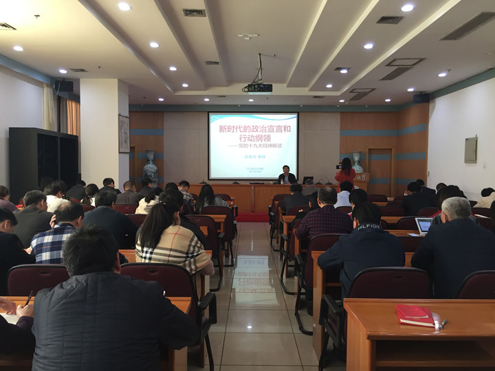 徐进功从十九大主题、历史成就、进入新时代、新时代的基本矛盾、新时代的历史使命、新时代思想和方略、开启新征程、理论分析和政策指导等八个方面入手,理论联系实际,旁征博引、深入浅出,以幽默风趣的语言风格,为大家解读十九大精神亮点。