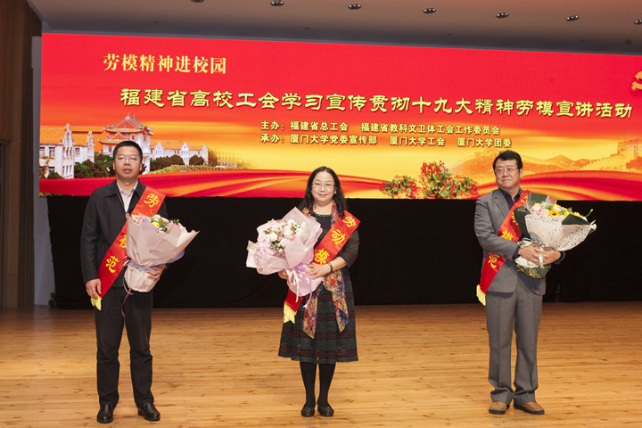 为了深入学习贯彻十九大精神,宣传工匠人才、弘扬劳模精神,11月29日上午,福建省高校工会学习宣传贯彻十九大精神劳模宣讲活动在我校科学艺术中心举行。全国劳动模范、福建省总工会、厦门港务控股集团有限公司工会冯鸿昌副主席,厦门市劳动模范、物理科学与技术学院特聘教授康俊勇教授,厦门市劳动模范、法学院副院长李兰英教授,为现场的五百多名工会干部、师生代表做了场精彩的宣讲报告会。