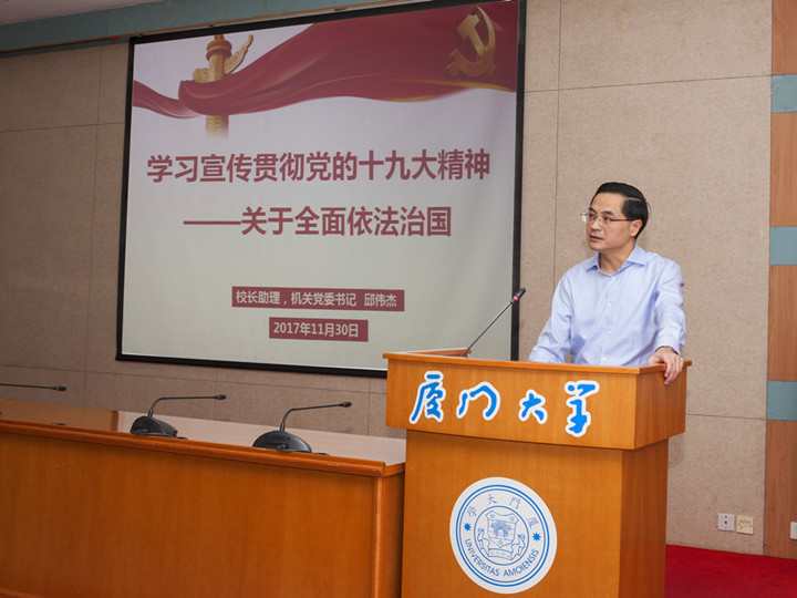 11月30日下午,第十三期机关干部论坛暨机关党委学习宣传贯彻党的十九大精神系列第二场报告会在颂恩楼220报告厅举行。校长助理、机关党委书记邱伟杰以“学习宣传贯彻党的十九大精神——关于全面依法治国”为题作专题党课报告。邱伟杰结合自身学习体会,系统梳理了十九大报告关于依法治国的重要论述,全面回顾了新中国法治建设历程,并分享了对依法治国若干重要问题的思考和理解。机关党委委员、资产处处长谢银辉主持报告会。