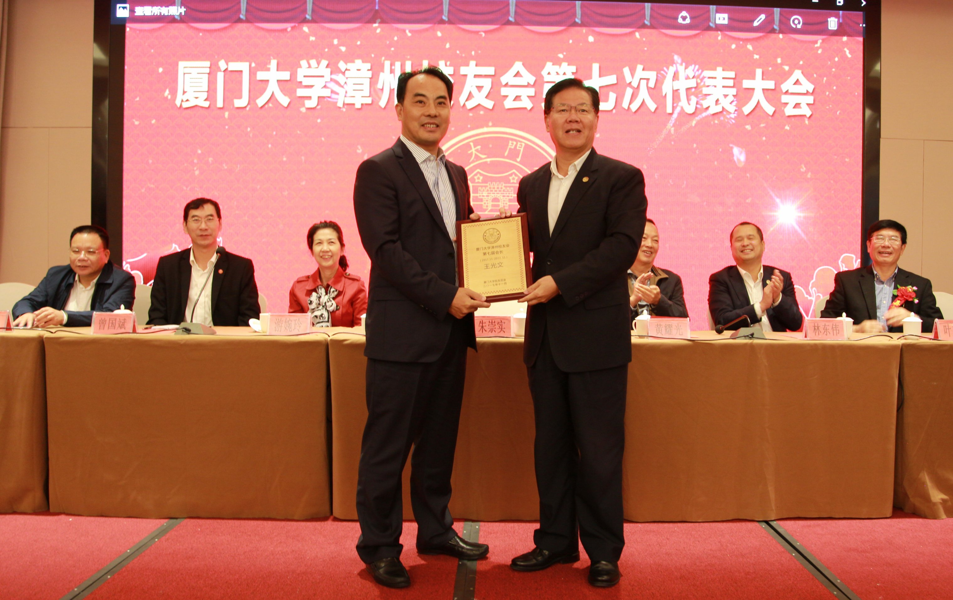 大会选举产生了厦门大学漳州校友会第七届理事会成员。王光文担任会长、吴两同担任执行会长、秘书长,吴炳龙担任常务副会长,何小青等担任副会长。朱崇实为王光文颁授了会长牌,为庄文海颁发“厦大校友服务奖”荣誉证书。