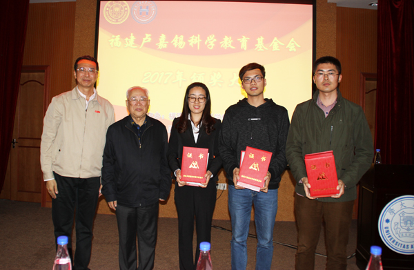 2017年度卢嘉锡优秀研究生奖获代表中国科学院福建物质结构研究所博士生胡发露、厦门大学化学化工学院博士生曹凌云、福州大学化学化工学院博士生宋晓荣也先后接受获奖证书并发表获奖感言。他们表示获得卢嘉锡优秀研究生奖既是一种荣誉,更是一种激励和责任,今后将会继承和发扬卢嘉锡先生的精神,努力学习,敢于创新、探求真理、勇攀登科研高峰,为国家科技事业发展做贡献。