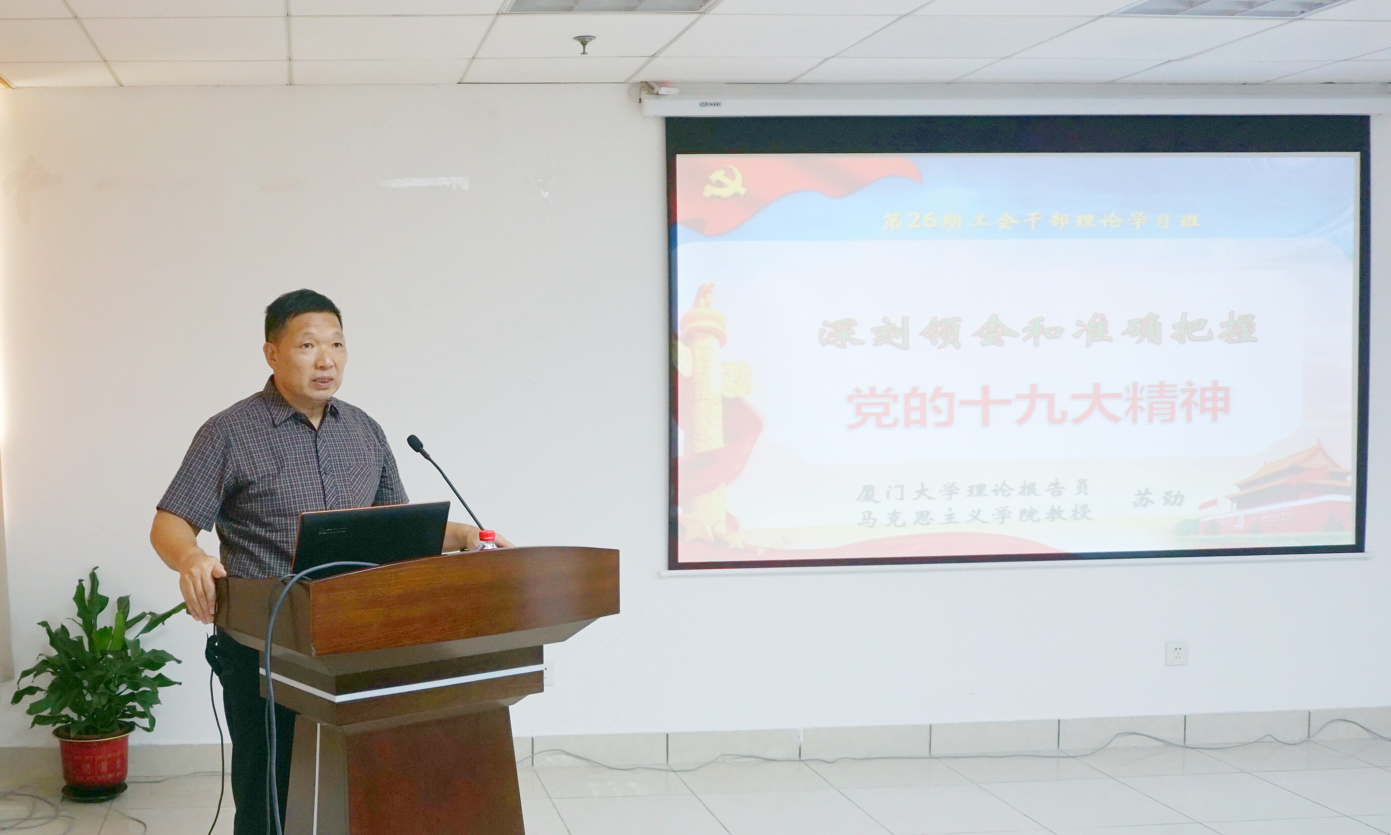 厦门大学理论报告员、马克思主义学院苏劲教授应邀作了《深刻领会和准确把握党的十九大精神》报告,他以新时代、新思想、新征程为章,深入浅出解读进入中国特色社会主义新时代的深远意义、基本内涵、社会主要矛盾变化和习近平新时代中国特色社会主义思想的主要内容,详细阐述从全面建成小康社会到基本实现现代化,再到全面建成社会主义现代化强国的战略安排。苏劲教授精辟的讲解加深了大家对党的十九大精神的理解。