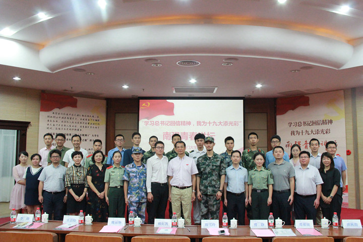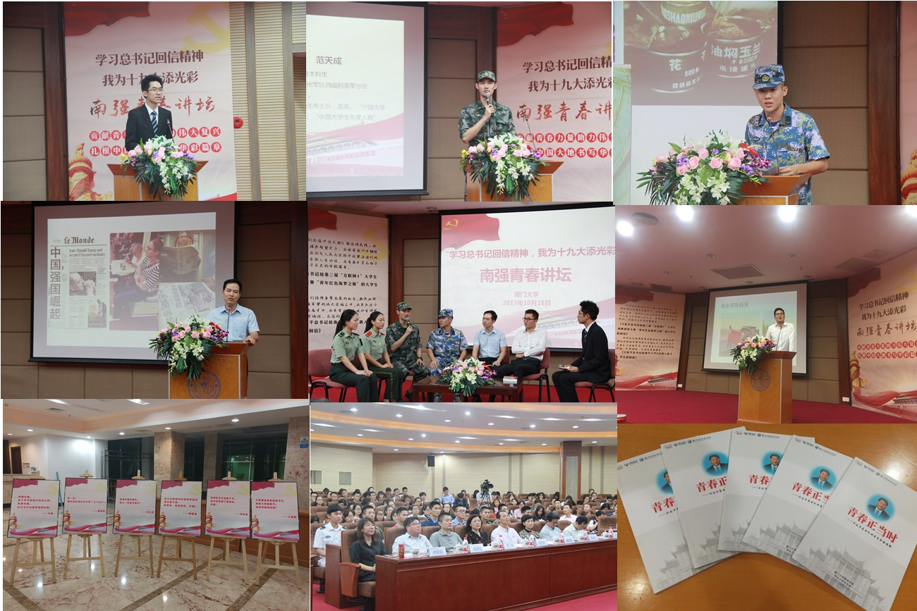 10月18日晚,由校党委学生工作部、人民武装部、管理学院联办的以 “学习习近平总书记回信精神,我为党的十九大添光彩”为主题的南强青春讲坛在克立楼三楼报告厅举办,讲坛以习近平总书记“把激昂的青春梦融入伟大的中国梦”的亲切嘱托为主旨,以习近平总书记在党的十九大开幕会上的报告为契机,鼓励在场师生勇敢抒发心中的青春梦想。