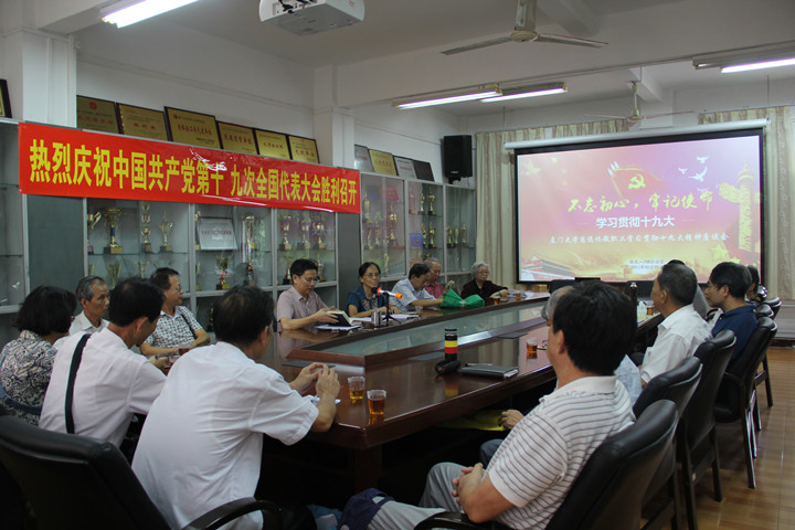 校关工委主任陈力文、常务副主任黄如彬,宣传部原部长洪桂芳,人文学院老教授苏振富,航空航天学院退休教工党支部书记曾权、蔡建立,离休干部曾淑萍、催化退休教工党支部书记傅锦坤等老同志先后发言,交流对十九大报告的学习体会。