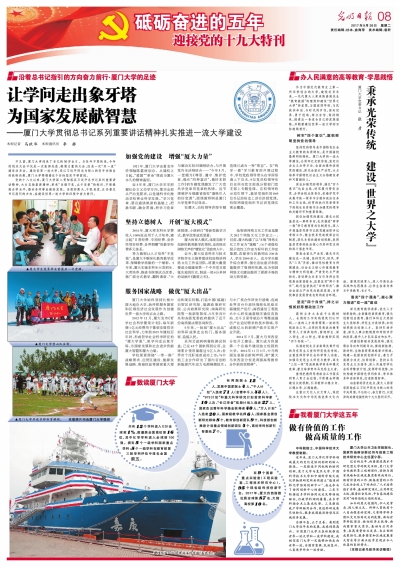 9月26日,《光明日报》“砥砺奋进的五年 迎接党的十九大特刊”整版推出我校报道,详细报道自党的十八大以来,我校深入贯彻落实习近平总书记系列重要讲话精神,大力弘扬嘉庚精神,秉承“自强不息,止于至善”的校训,在建设世界一流大学的征程中取得的成就。