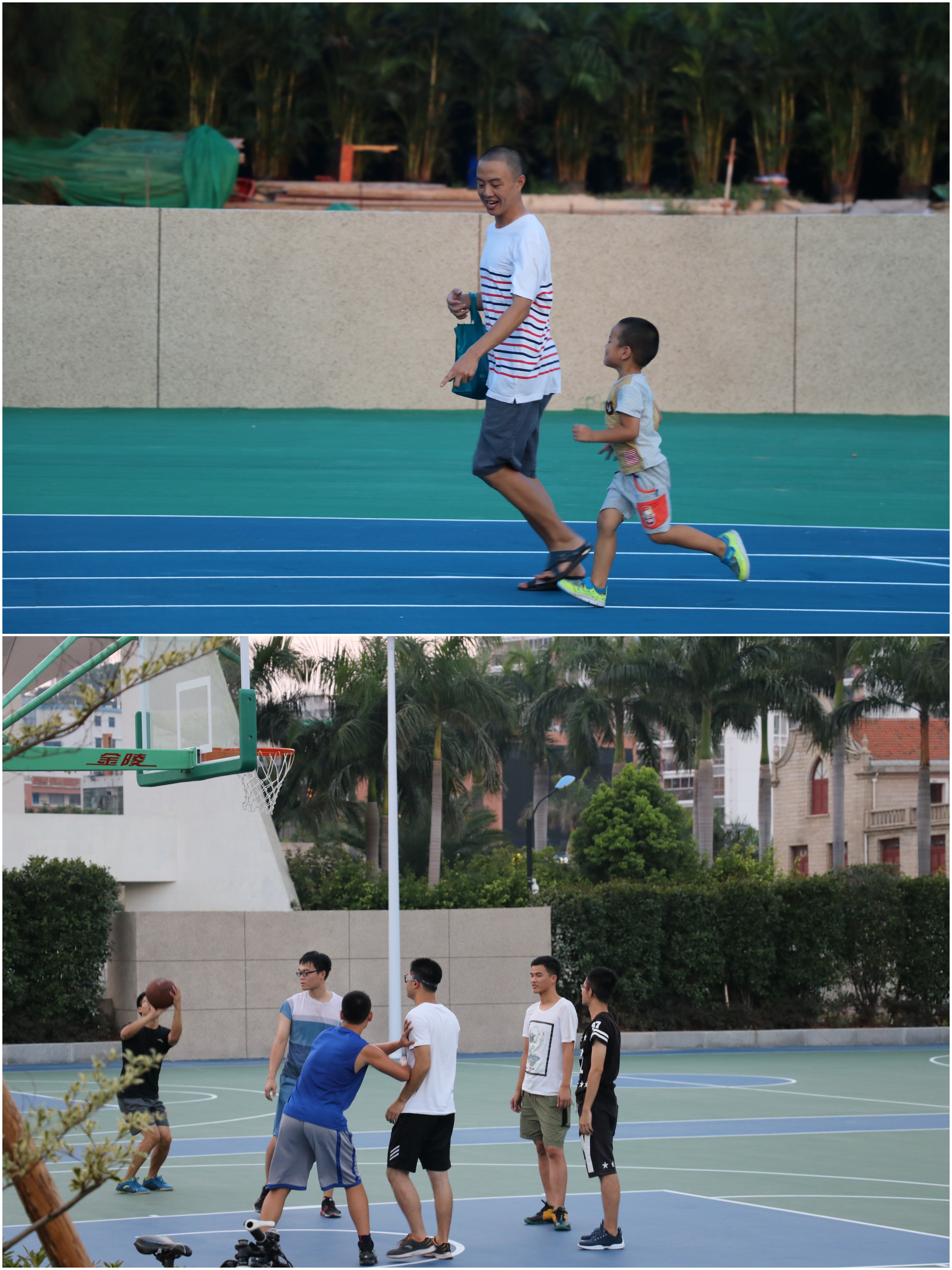 而在足球场的另一边,19个标准化篮球场一开始仅有一位教职工带着孩子在练习投篮。不到半个小时,四五队人已经在球场集结。由七八位教职工组成的团队在球场边换球鞋、热身,他们告诉笔者,这是他们第一次来,一听到球场开放了,几位球友就立马相约来试试看。“我们是第一批吃螃蟹的人”,他们形象地打着比喻,一上场运球投篮,一位教职工就发自肺腑评价道:“这球场可以啊,以后就是我们运动的首选啦!”另一个场次则是由几个“散户”同学“拼”出来的,他们对新篮球场也十分满意,他们说:“这么多个场地,资源十分充足,再也不用担心没有场地了。”他们表示,学校提供的优质硬件设施非常给力,为大家提供了更多选择。