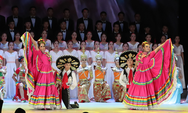 “一花独放不是春,百花齐放春满园。”含有各受邀国文化元素的歌舞表演压轴登场,南非的《非洲时刻》、泰国的《漂水灯》、几内亚的《几内亚舞曲第二号》、埃及的《木卡姆》、巴西的《桑巴舞曲》、墨西哥的《墨西哥草帽舞》、中国的《茉莉花》等精彩舞段别具风格。伴随着时而欢快、时而婉转的乐曲,演员们尽情舞动,充分展现着各国民族风情,表达了世界人民携手打造“人类命运共同体”,共创美好未来的诉求。