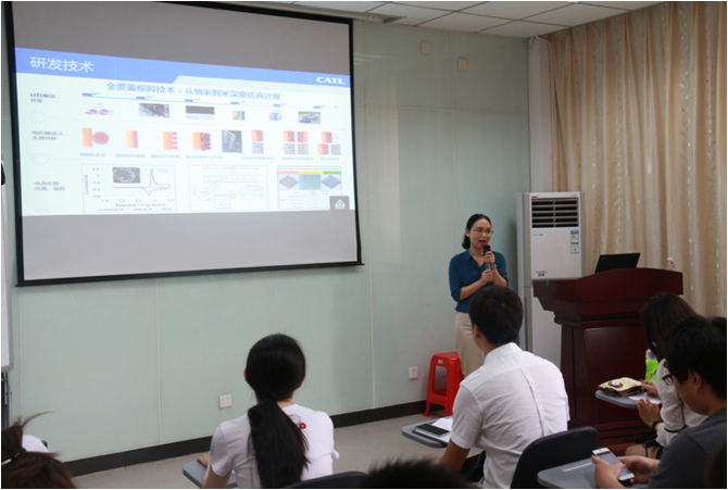 CATL研发部拥有EVC(电芯开发)、PD(产品部)、RI(研究院)和BMS(电池管理系统)四大核心部门以及CL(中心实验室)和MRD(制造研发部)两大部门。在与公司部门面对面的交流活动中,这些公司的重要部门经理分别就各自部门主要职责和需求方向给大家进行了形象生动的介绍,队员们认真听完后踊跃发言提问,部门经理们耐心解答队员们的问题,让队员们对公司的研发组织架构都有了一个深入的了解。为了提高同学们的求职面试技巧,CATL的HR经理詹铭敏还给实践队开设了一场的求职大讲堂。他不仅现身说法,为大家讲解了许多求职路上的困惑,还耐心解答大家提出来的各种各样的求职问题,分享他在公司招聘过程中所获得的经验总结。