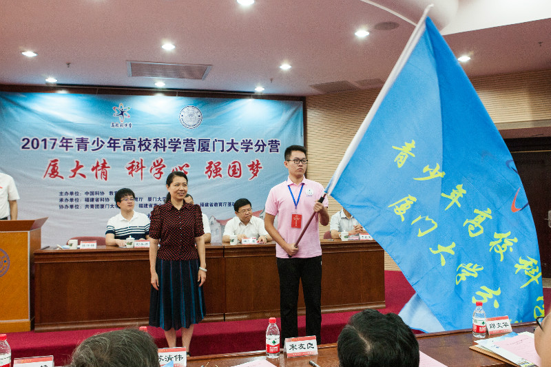 随后,来自平潭第一中学的高芷灵同学作为营员代表发言。福建省青少年科技活动中心侯小慰主任向营员代表授厦门大学分营营旗。与会领导共同启动了2017年青少年高校科学营厦门大学分营。