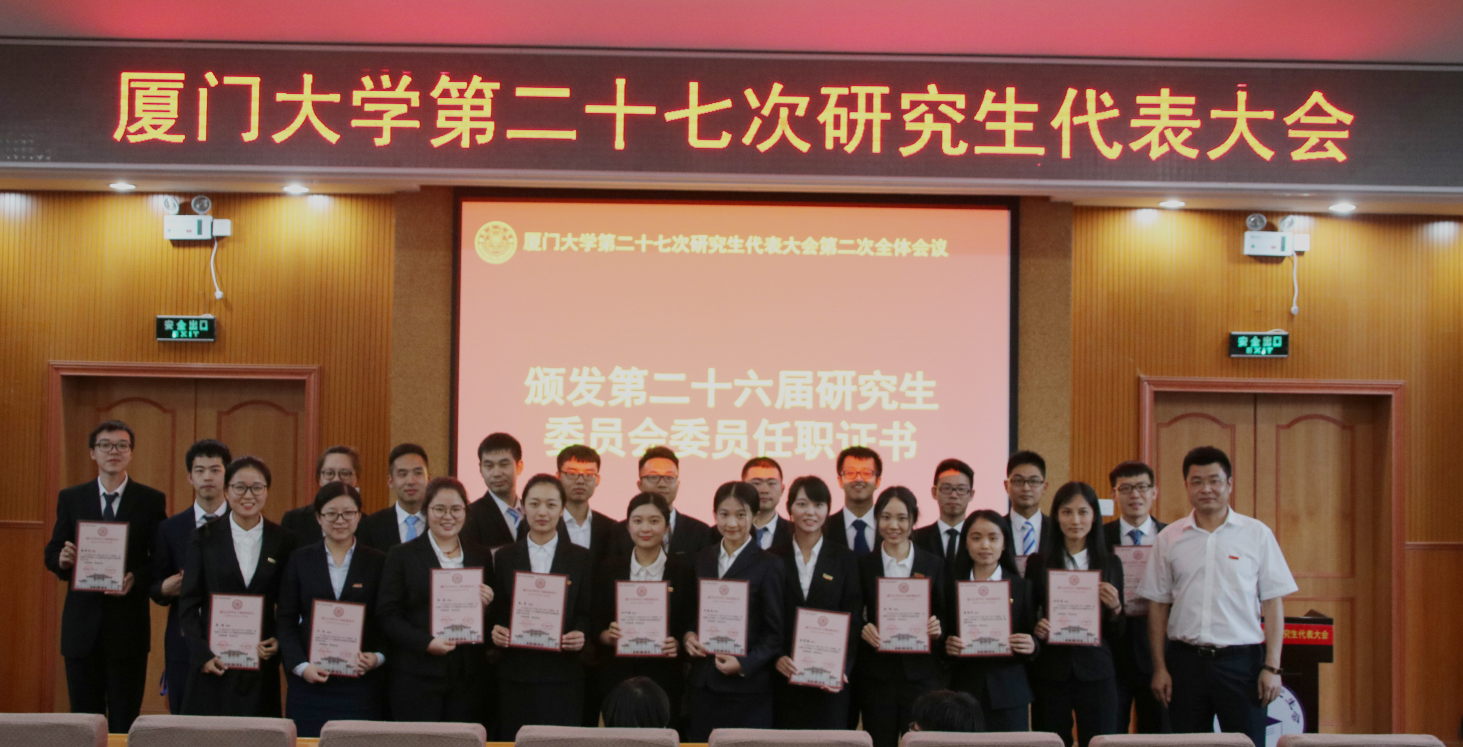 全体代表听取并审议了校研究生会主席黄曦代表第二十六届研究生委员会所做的工作报告,大会通过无记名投票选举产生了厦门大学第二十七届研究生委员会。会上,校团委书记陈怀锋为第二十六届研究生会委员颁发任职资格证书,并为2016-2017学年优秀院研究生会、优秀院研究生会主席颁发荣誉证书,大会在全体代表齐唱校歌中圆满落幕。