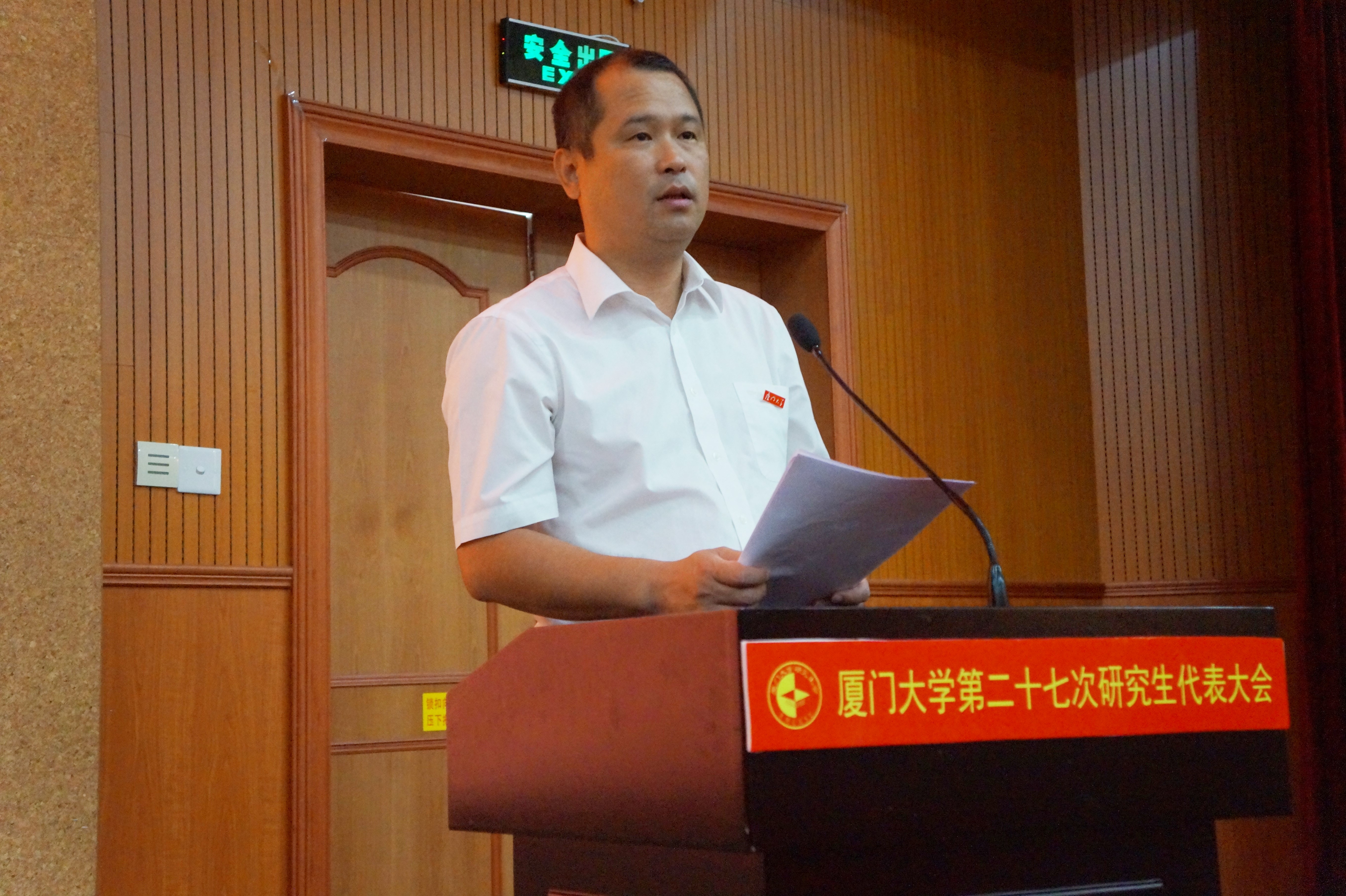 7月9日,我校第二十七次研究生代表大会在思明校区化学报告厅召开。校党委副书记林东伟,校关工委主任陈力文,校关工委常务副主任黄如彬,校关工委副主任郑保东,福建省学生联合会执行主席王季潇,校党委组织部部长梁卫中,校党委宣传部部长徐进功,校党委学生工作部部长夏侯建兵,校党委保卫部部长苏清伟,校团委书记陈怀锋,研究生院综合办副主任王晟及各学院党委、团委负责人出席大会开幕式。