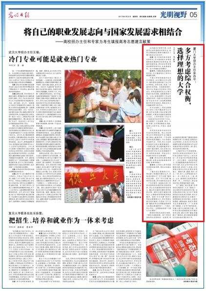 《光明日报》6月22日第五版(光明视野)刊发题为《多方考虑综合权衡,选择理想的大学》的专访。文章就考生如何选择学校和专业、如何合理填报志愿等问题采访了厦门大学招生办副主任余自中,帮助考生在海量的信息中选择理想的大学和专业。