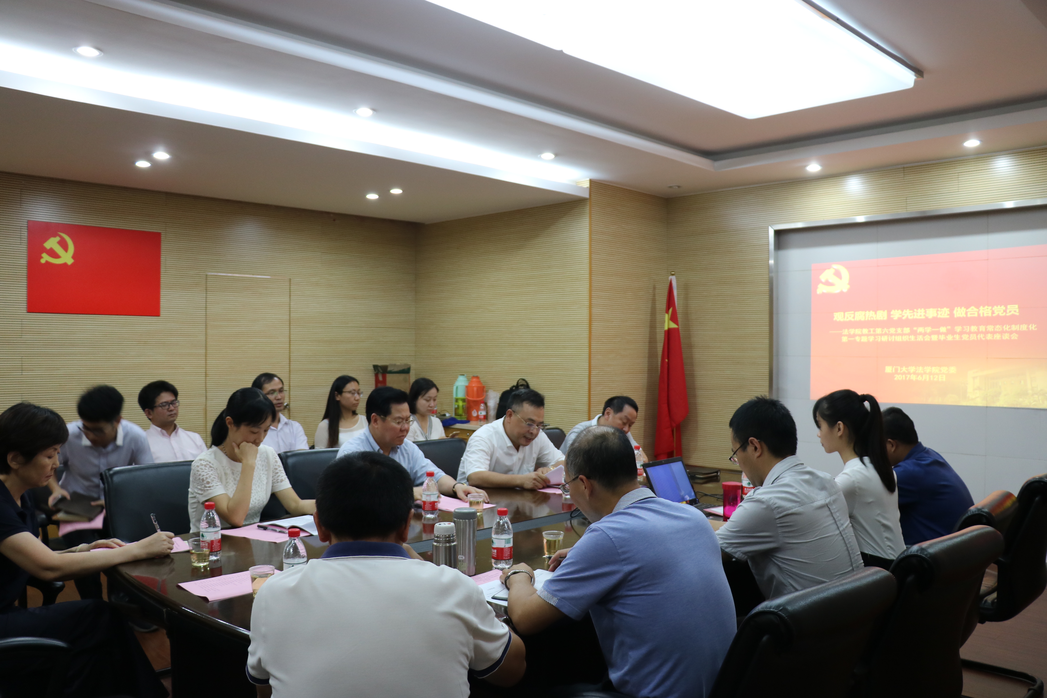 6月12日下午,法学院教工第六党支部在法学院601会议室组织召开“两学一做”学习教育常态化制度化第一专题学习研讨组织生活会暨毕业生党员代表座谈会,校长朱崇实,支部全体党员、法学院教师代表、2017届毕业生代表参加活动。学校党委组织部、宣传部、学生处有关负责人出席活动。会议由学院党委书记李智勇主持。