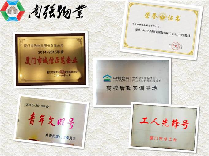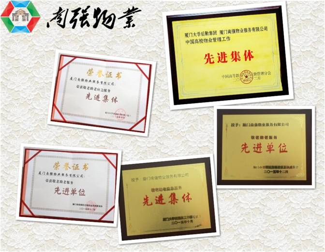 公司承接的管理服务项目日渐得到广大业主、客户的认可以及社会肯定,公司被中国高等教育后勤协会物业管理专业委员会授予“中国校园物业服务实体(企业)百强”企业五十强、“中国高校物业管理工作先进集体”,被中物教育授予“高校后勤实训基地”,被厦门市授予“工人先锋号”、“青年文明号”、“诚信示范企业”,被厦门大学离退休工作部(处)授予“敬老助老服务先进集体”,厦门市思明区白城居民委员会授予“敬老助老服务先进单位”等荣誉称号。