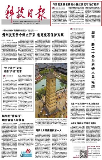 4月11日在《科技日报》头版报眼“最新发现与创新”栏目刊发题为“与青蒿素齐名的雷公藤红素或可治疗肥胖”的消息,报道我校药学院张晓坤团队的最近研究成果。