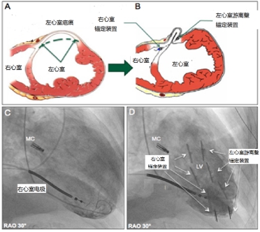 随后,心内科医生从患者的右侧颈静脉置入导管,导管沿着静脉小心翼翼地通向心脏,一路“铺设轨道”,沿着右心房直达左右心室的交界处,然后留下一个类似锚的装置,并等待从左侧小切口同样送入另一个锚定装置,附在室壁瘤外壁。