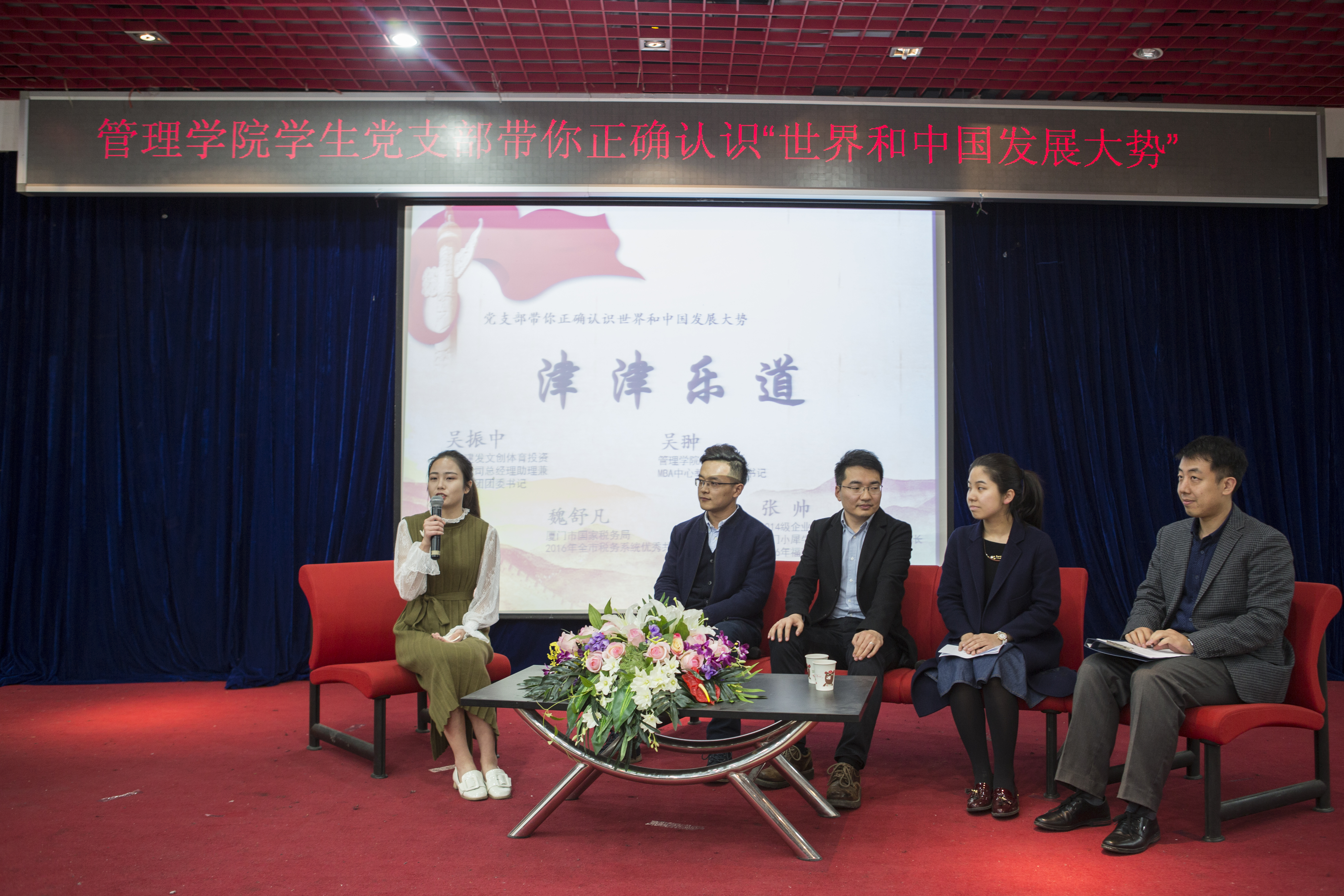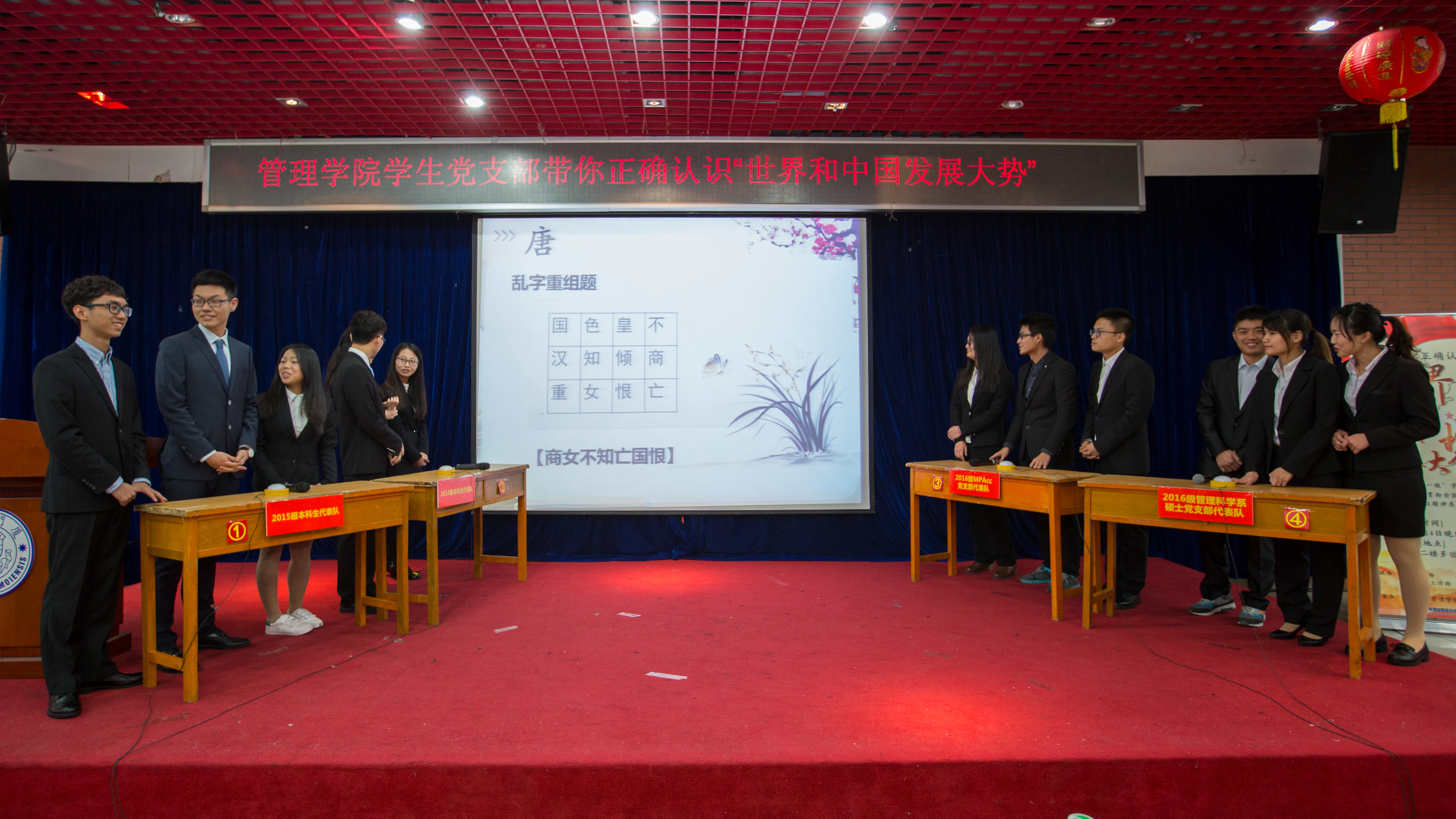 “作为青年学生,如何将参加这次党支部沙龙中所培养的自信,转化为担负起实现中国梦的责任,是我们要一起思考的命题”,3月14日晚,在由校党委组织部、党委宣传部、党委学生工作部、校团委和管理学院党委联办的主题为“两学一做”学习教育之“基层党支部带你正确认识‘世界和中国发展大势’”的党支部沙龙上,校党委副书记、副校长李建发以亲身感悟寄语在场师生党员。此次活动中,师生党员们以“文以载道”、“专家论道”和“津津乐道”为三个不同的论题,以“道”促“学”,拓展了基层党支部学习贯彻全国高校思想政治工作会议精神的新路径。