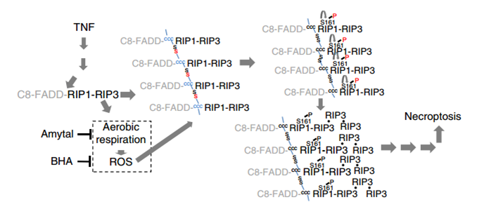 韩家淮教授课题组的这项研究表明,这两个科学问题是相关联的。研究人员利用质谱技术首次证实,RIP1通过其上的三个关键的半胱氨酸(C257,C268和C586)直接接受ROS的氧化调控,进而增强激酶活性,发生第161位丝氨酸(S161)的自磷酸化。他们证实了RIP1的激酶活性在程序性细胞坏死中的主要功能是自磷酸化S161,且S161就是人们长期寻找的RIP1上与坏死相关的功能性磷酸化位点。坏死小体的形成是程序性细胞坏死发生的必要复合物,而S161的磷酸化是RIP1有效募集RIP3形成有功能的坏死小体所必需的。由于ROS的产生依赖于坏死小体里的RIP3的功能,因此ROS介导了程序性坏死通路里的正反馈调控。