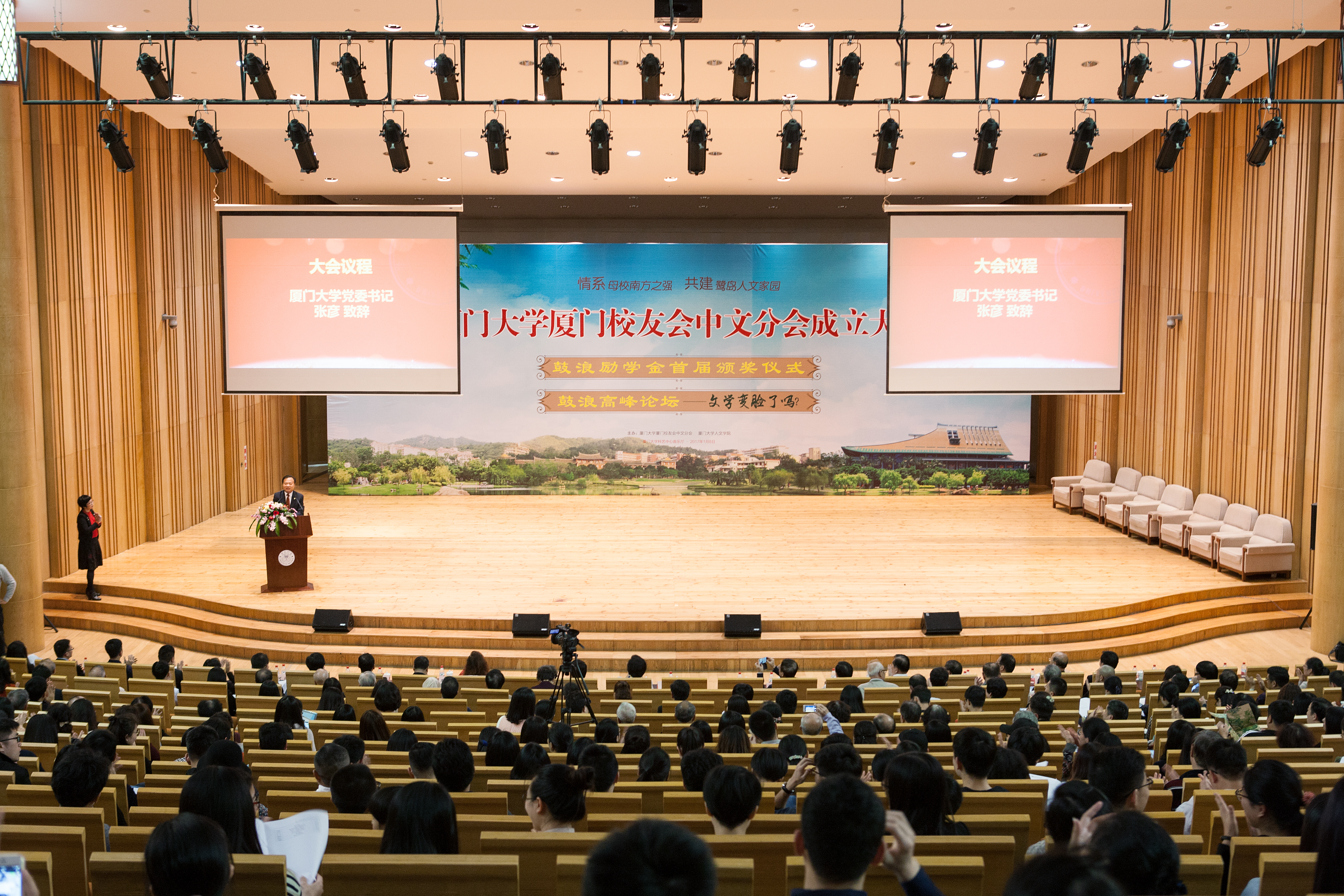 芙蓉湖畔执手话旧,凤凰树下并肩履新。1月8日下午,我校科学艺术中心报告厅群贤毕至、少长咸集,400多名中文系校友欢聚在此,隆重召开厦门大学厦门校友会中文分会成立大会暨鼓浪高峰论坛。校党委书记张彦,副校长、校友总会副理事长詹心丽出席大会。