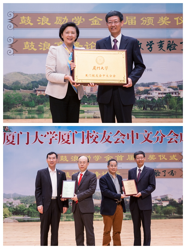 本次大会还创立了 “鼓浪励学金”。中文系系主任李无未教授代表中文系接受捐赠,教育发展基金会办公室副主任赵晓慧为校友代表颁发捐赠证书。2014级中文系本科生孙培婷等15位学生及团体成为首届获得者。系友代表黄毓斌等为他们颁发荣誉证书。“鼓浪励学金”是由中文系校友自主发起的助学善意行动,它缘起于95周年校庆期间,旨在支持厦门大学人文学院教育事业的发展,促进在创新、创作、创业、访学交流、志愿服务等方面表现优异的学生成长成才。这是首次以院系各年级为单位发起和设立的励学金基金,首期由中文系1977级至1990级14个年级的校友共同发起设立。