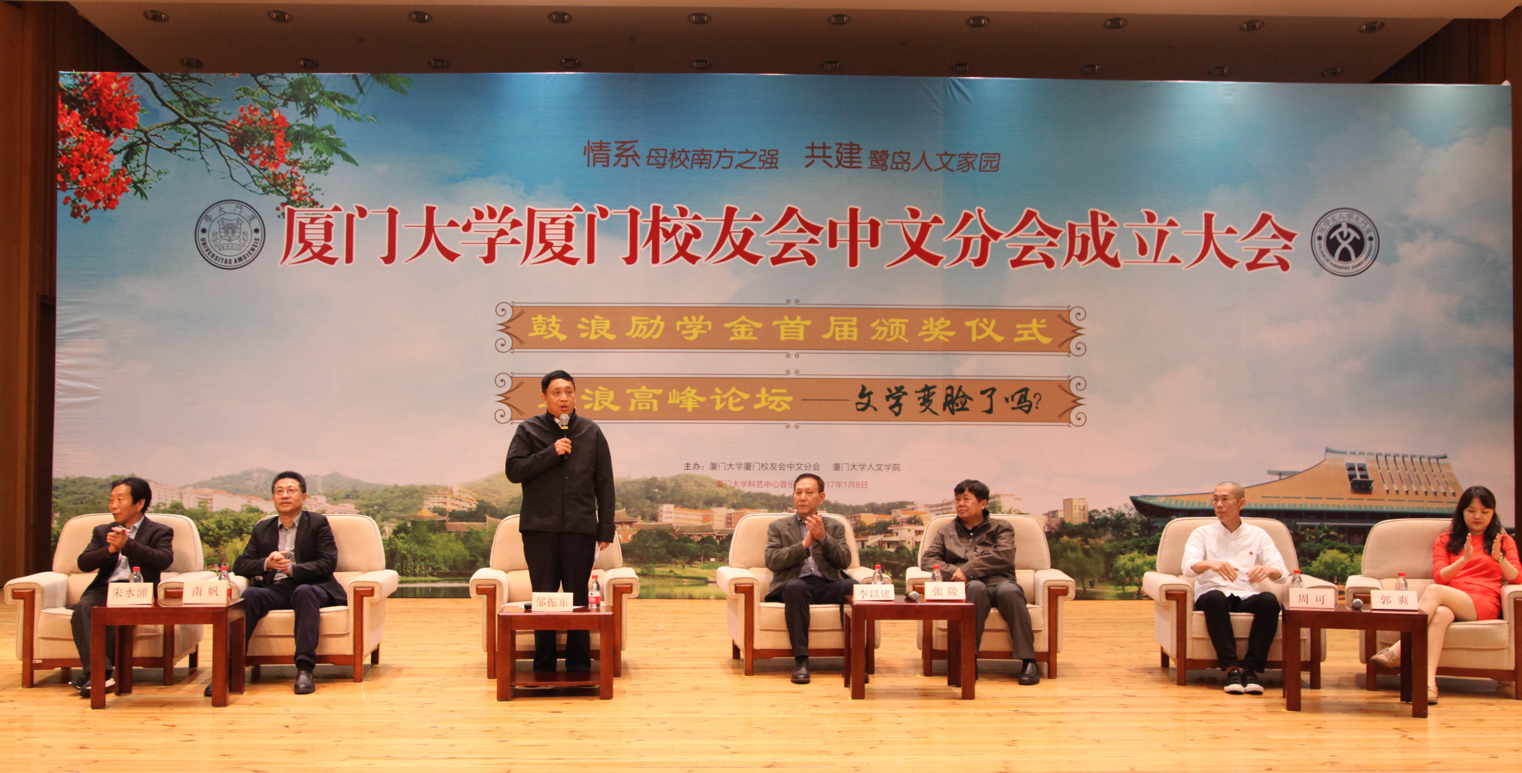 此外,继厦门大学厦门校友会中文分会成立大会结束后举办的“鼓浪高峰论坛”是当天活动的另一大亮点。此次论坛由新闻传播学院特聘教授邹振东主持,本次论坛汇聚了福建省政协副主席、省文联主席、省社科院院长、教授、著名作家、文学评论家南帆,厦门大学中文系教授、著名文学评论家朱水涌,金庸秘书,著名金庸研究专家、文学评论家李以建,著名文学评论家张陵,华南理工大学教师、《新周刊》杂志副主编、新周刊(广州)新媒体发展有限公司执行总裁周可以及著名作家郭爽等多位文坛大咖。这些中文系校友围绕“文学变脸了吗”这一主题,从诺贝尔文学奖说起,探讨了当代文学的新变化、大学尤其是中文系是否以培养作家为目标、作家与金钱之间的关系、中文系是否依然会存在等问题。论坛嘉宾时而成竹在胸、高谈论阔,时而若有所思、娓娓而谈,时而妙语连珠、语惊四座,各嘉宾对文学与人生的理解,引发校友对文学的深刻思考。这场关于文学主题的论坛在新年之际注定是一场震撼心灵的文学盛宴,也必将为文学的世界打开一扇更加明媚的希望之窗。