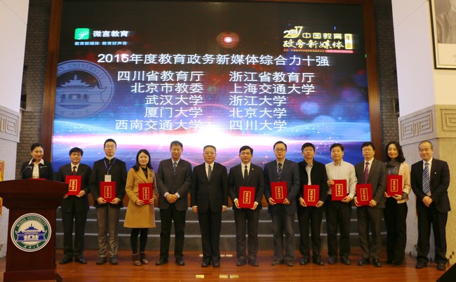 1月5日,在武汉大学召开的“2017中国教育政务新媒体年会”上,我校再次荣膺“中国教育政务新媒体综合力十强”称号。这是我校连续第三年获此殊荣。该奖项是目前全国教育系统新媒体建设方面的最高荣誉,至今已颁发三届。其他获得“十强”称号的单位还有四川省教育厅、浙江省教育厅、北京市教委、上海交通大学、武汉大学、浙江大学、北京大学、西南交通大学、四川大学。教育部党组副书记、副部长沈晓明出席会议发表讲话并为十强单位颁奖。