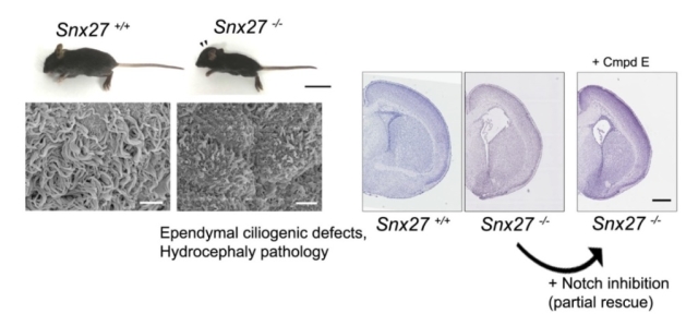 研究团队发现SNX27缺失会引起小鼠的先天性脑积水表型:新生小鼠的侧脑室中充溢脑脊液和明显扩大。深入研究发现在SNX27缺失小鼠侧脑室边缘缺少一种参与脑脊液循环的细胞——室管膜细胞。该研究还明确了SNX27缺失导致脑中的神经干细胞产生过度激活的NOTCH蛋白,阻止了神经干细胞分化形成室管膜细胞。NOTCH蛋白的激活是由γ-分泌酶剪切介导的,γ-分泌酶的活性又受SNX27调节。给SNX27缺失孕鼠注射一种γ-分泌酶/NOTCH抑制剂可以明显阻止新生小鼠脑积水的发展,进一步证明了γ-分泌酶/NOTCH通路参与脑积水的发生发展,该研究为将来在临床上应用γ-分泌酶抑制剂治疗由室管膜细胞缺陷引起的脑积水提供了可能的理论支持。