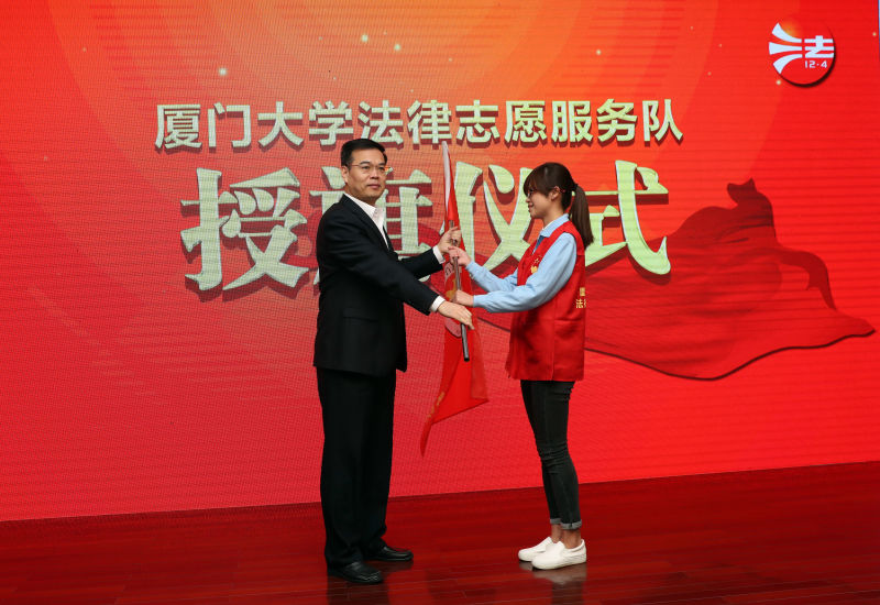 会上,市政府副市长林锐庄重地为厦门大学法律志愿服务队授队旗,将这份光荣而重要的责任交到了我校志愿者手中。厦门大学法律志愿服务队是厦门市司法行政法律志愿服务队第二十支分队,服务队以厦门大学法学院学生为主体成员,将充分利用法学院优厚的学术资源,为广大师生以及市民群众提供专业法律咨询、普法宣传等服务。
