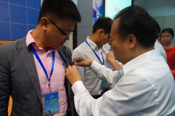 开学式在全场齐唱厦门大学校歌中开始。张彦和杨斌代表学校,为新进教职工代表佩戴了厦门大学校徽。