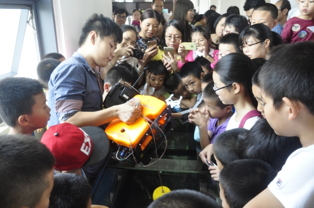 在开放日现场,“嘉庚号”科学考察船模型备受关注,各类浮标、潜标、卫星遥感技术、水下机器人等高新技术一一展现在公众面前,工作人员通过浮力小魔术介绍潜标工作原理、用模型演示海洋内波现象;无人机3D体验站还带领参与者跟随无人机鸟瞰滨海湿地世界,同时呈现“莫兰蒂”展示给翔安校区的影响。