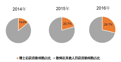 ——项目申报喜获佳绩 2016年,我校中国博士后科学基金第59、60批面上资助获资助率分别为50%和41.4%(全国平均资助率分别为34%和31.8%),第60批获资助人数为29人,其中22人为2016年进站的博士后。另外,可喜的是,2016年我校共有43名博士后申报国家自然科学基金青年基金项目,其中27名获资助,获资助率为62.7%,占全校青年基金获资助总数的28.7%。通过历史数据对比,近三年,我校博士后在全校国家自然科学基金青年基金项目申报中的贡献率逐年提升。
