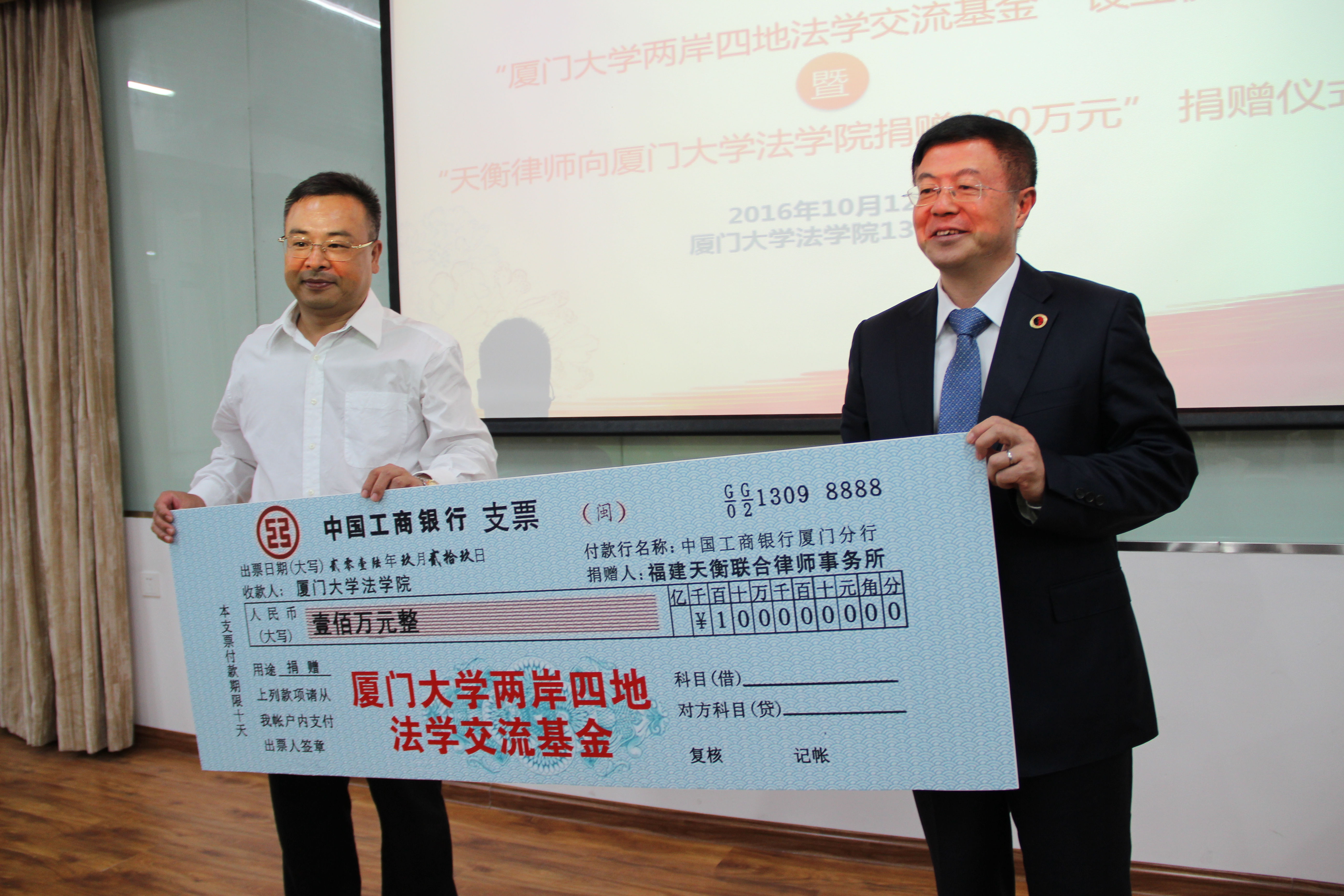 天衡所以法学院建院90周年庆为契机,向法学院捐赠100万元发起设立“厦门大学两岸四地法学交流基金”,这是法学院90周年庆收到的一份厚重又极具意义的大礼,该基金是全国首个针对两岸四地法学交流用途的基金。据悉,基金主要用于资助法学院开展的各项与台湾、香港、澳门三地的法学学术交流、学生交流及教育培训活动;旨在促进两岸四地法学研究及教育交流、增进两岸四地的青年法律人的沟通与联系,更好地推动法学院法学基础学科建设,促进法学院更好更快地发展。